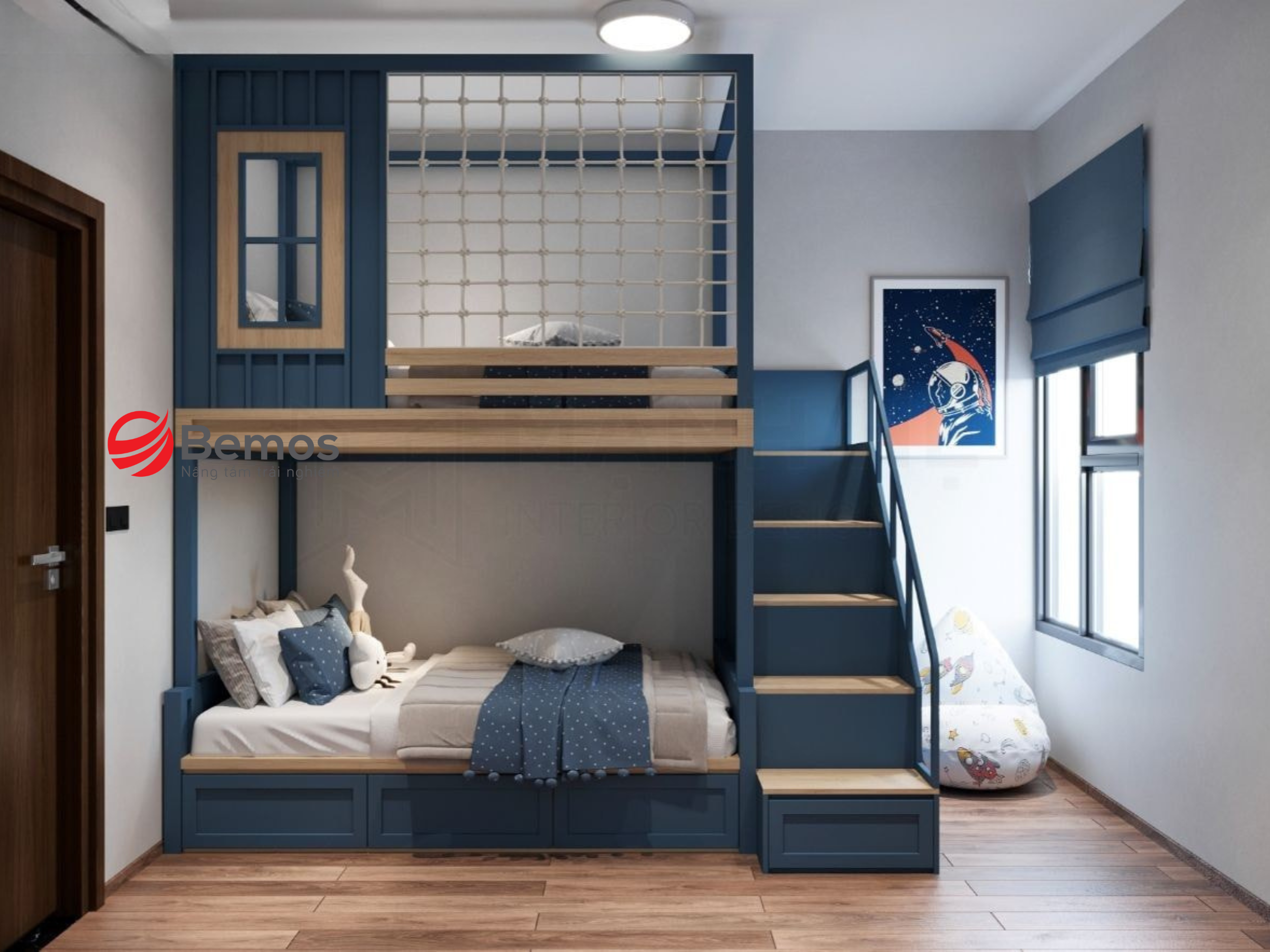 An toàn luôn là ưu tiên số một khi chọn giường tầng cho bé trai. Lan can phải cao ít nhất 35cm, khoảng cách thanh chắn không quá 8cm để tránh kẹt đầu tay. Bậc thang cần có độ ma sát cao, kết hợp dây đai cố định vào tường nếu tầng trên cao quá 1,5m.