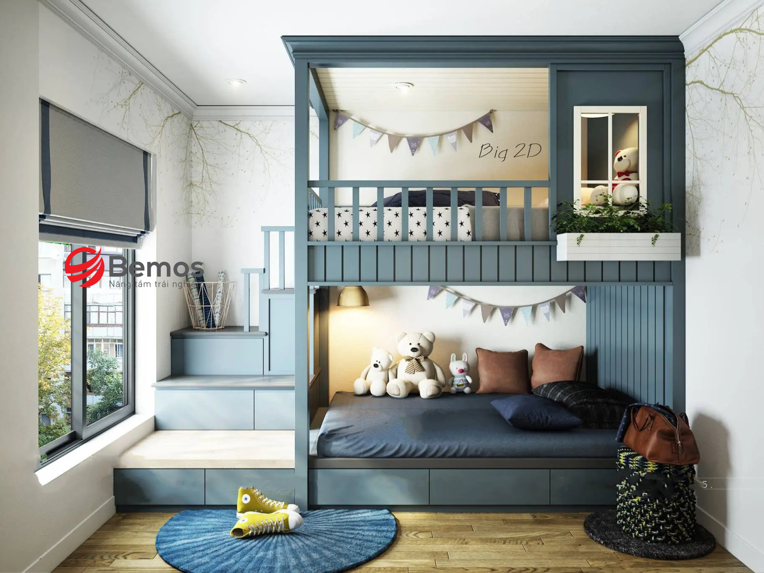 Biến khu vực dưới thành góc đọc sách với giá kệ thấp. Hoặc lắp tủ đồ chơi có bánh xe dễ kéo ra. Thêm giỏ treo tường đựng đồ lặt vặt, giữ phòng luôn gọn gàng.