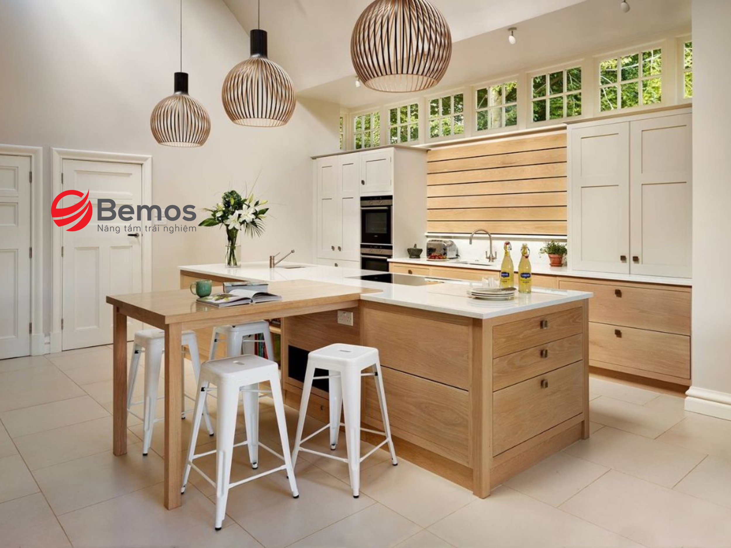 Tuy nhiên, bạn nên chọn loại gỗ có lớp phủ chống thấm để tránh hư hỏng do độ ẩm trong bếp. Một chiếc bàn gỗ công nghiệp với thiết kế mỏng nhẹ sẽ giúp không gian bếp trông gọn gàng hơn.