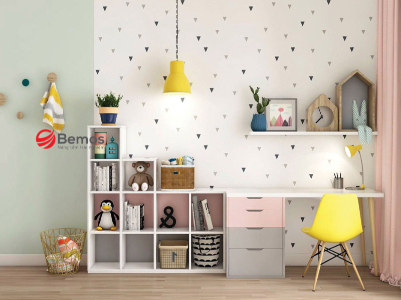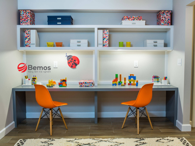 Bàn học sinh tiểu học ở nhà với tính năng tiện ích cao sẽ khuyến khích bé sử dụng bàn một cách hiệu quả hơn và giảm tình trạng lộn xộn đồ đạc. Phụ huynh có thể chọn thiết kế góc chữ L nếu không gian phòng cho phép để tăng diện tích sử dụng.