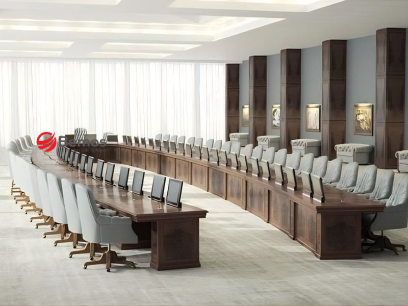 Mẫu bàn họp gỗ chữ U dành cho hội trường thường sử dụng gỗ tự nhiên cao cấp, mang vẻ đẹp ấm cúng và đẳng cấp. Thiết kế lớn với chiều dài từ 5 mét trở lên, phù hợp cho các cuộc họp quan trọng hoặc sự kiện. Mặt bàn vân gỗ tự nhiên kết hợp chân gỗ chắc chắn tạo sự trang nghiêm.