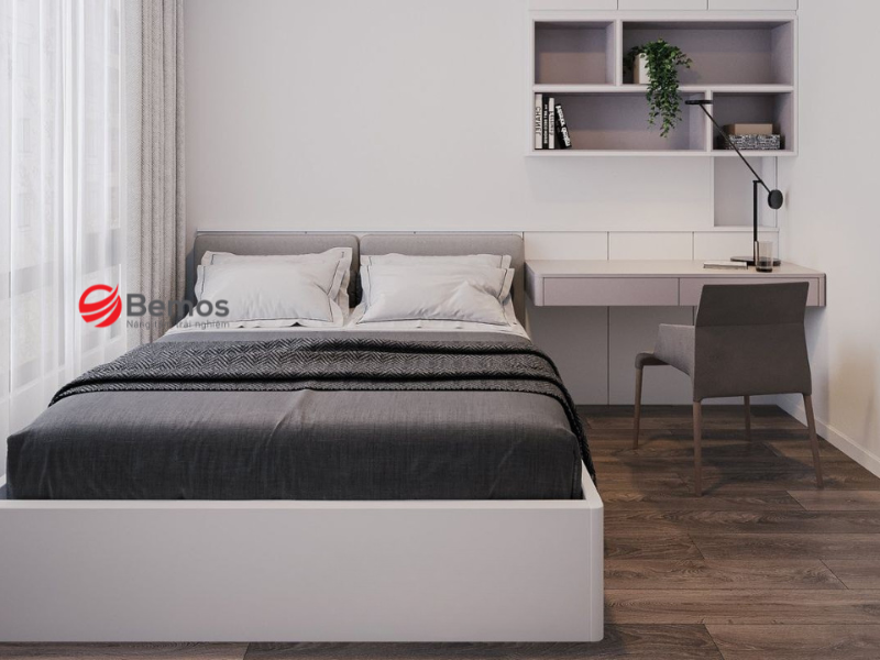Giường bệt sát sàn tạo cảm giác rộng rãi hơn cho phòng ngủ nhỏ hẹp. Thiết kế thấp giúp dễ dàng vệ sinh bên dưới và di chuyển đồ đạc khi cần.