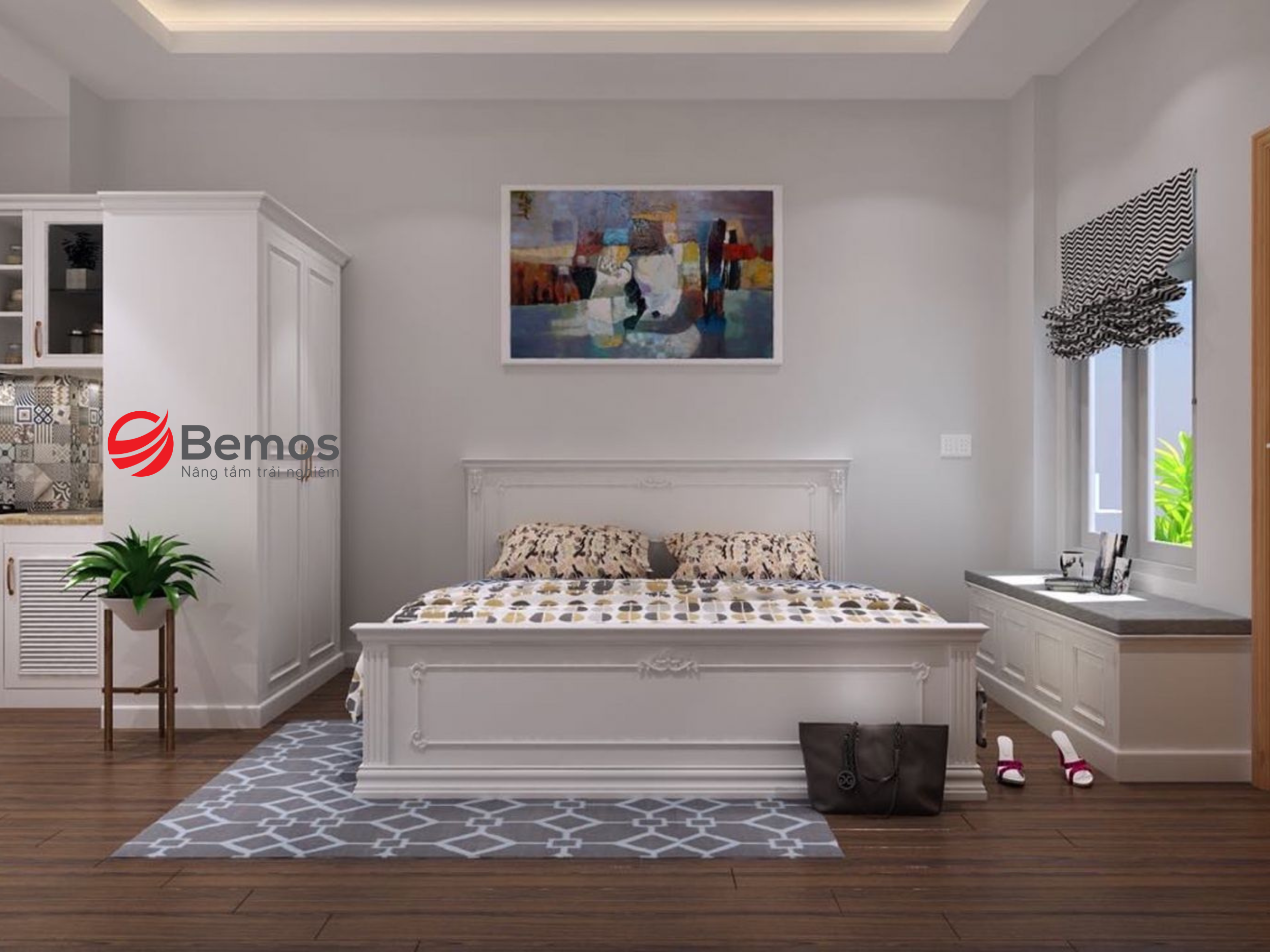 Nếu bạn yêu thích sự sang trọng, giường gỗ sơn trắng với các chi tiết chạm khắc tinh tế sẽ là điểm nhấn hoàn hảo cho phong cách tân cổ điển. Kết hợp với rèm lụa, đèn chùm hoặc gương trang trí, căn phòng sẽ toát lên vẻ quý phái, đẳng cấp.