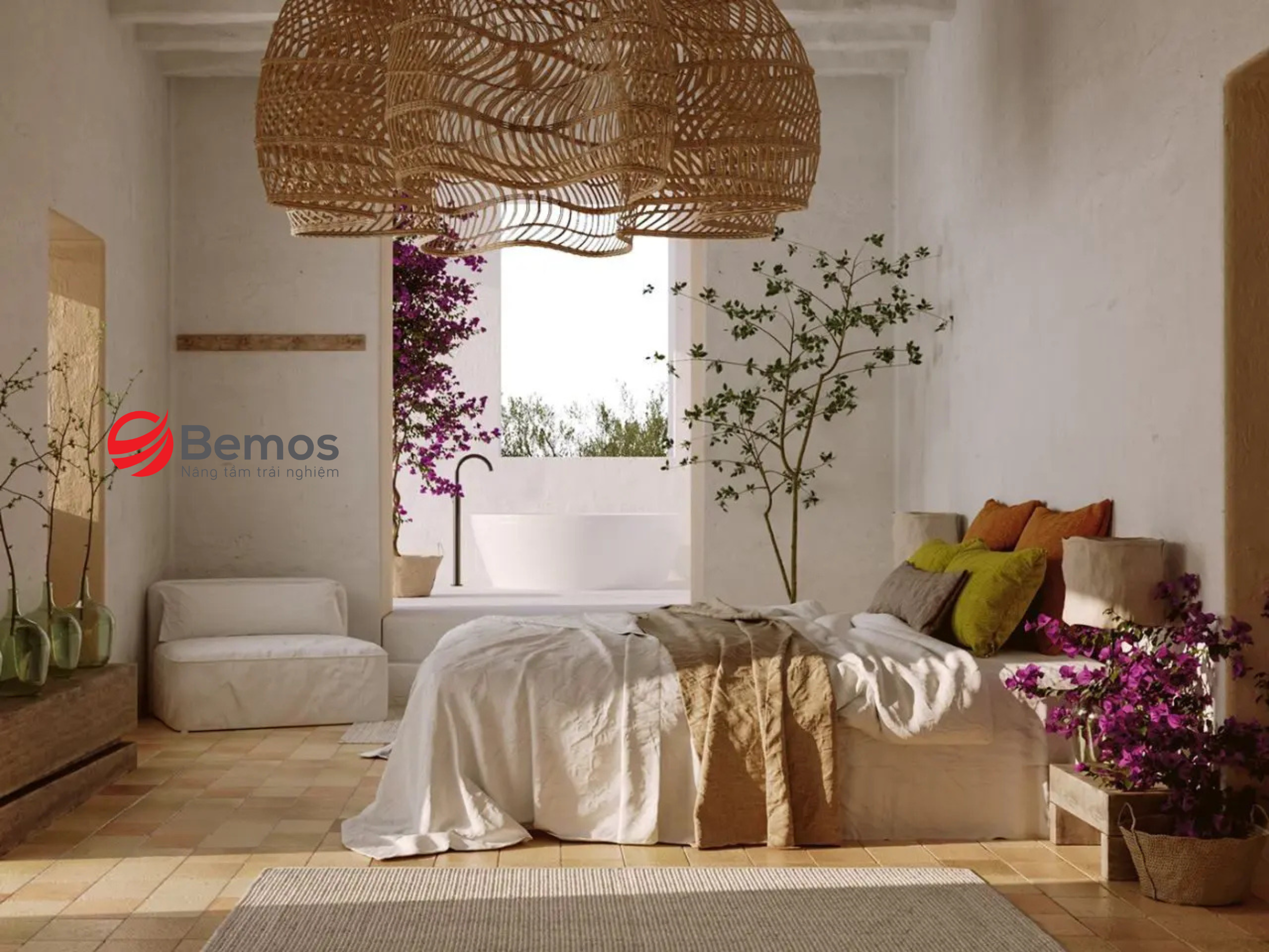 Thảm trải sàn với tông màu trung tính hoặc họa tiết đơn giản sẽ giúp không gian trở nên ấm áp hơn. Rèm cửa mỏng, màu trắng hoặc be, là lựa chọn lý tưởng để vừa giữ được sự riêng tư vừa cho phép ánh sáng tự nhiên len lỏi vào phòng.